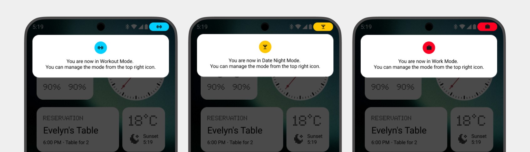 Holding the essential button from the lock screen opens the configuration menu alongside a sweeping light animation. After selecting "Date Night," the system drops the user into their curated home screen and updates the hardware to display an "Auto-Expire" progress bar. A persistent yellow status pill remains at the top right, letting users effortlessly tweak settings or exit the context to restore the standard OS.