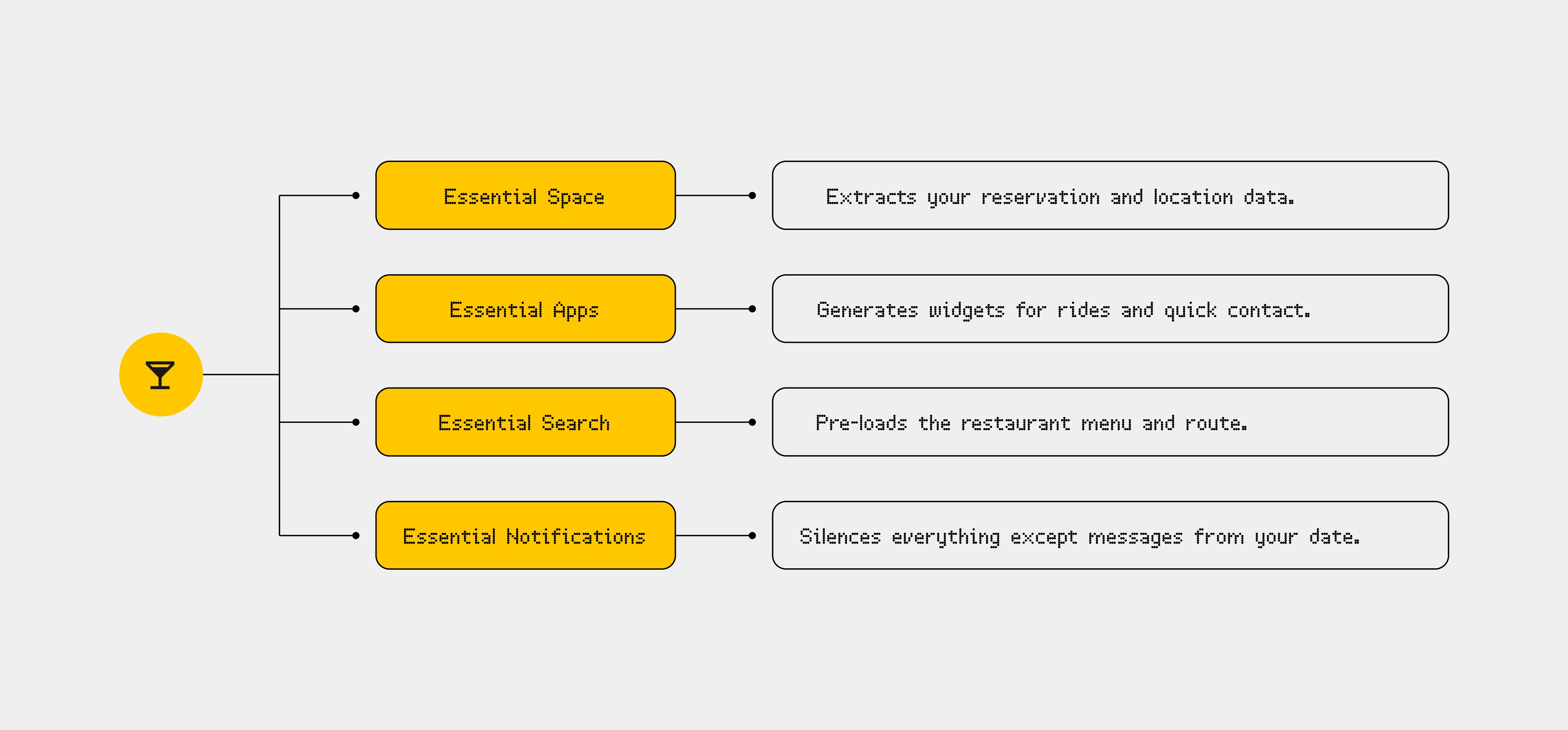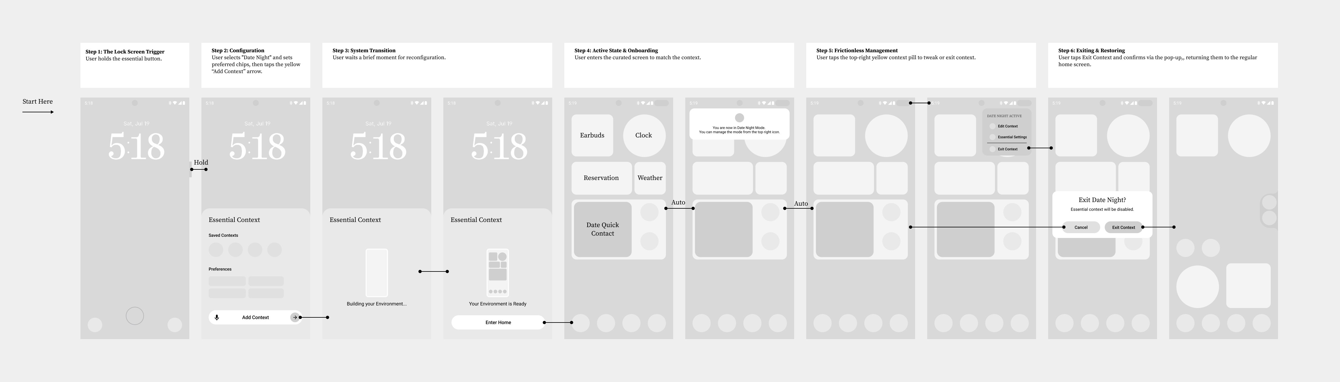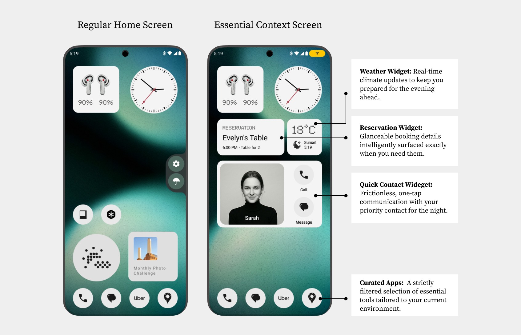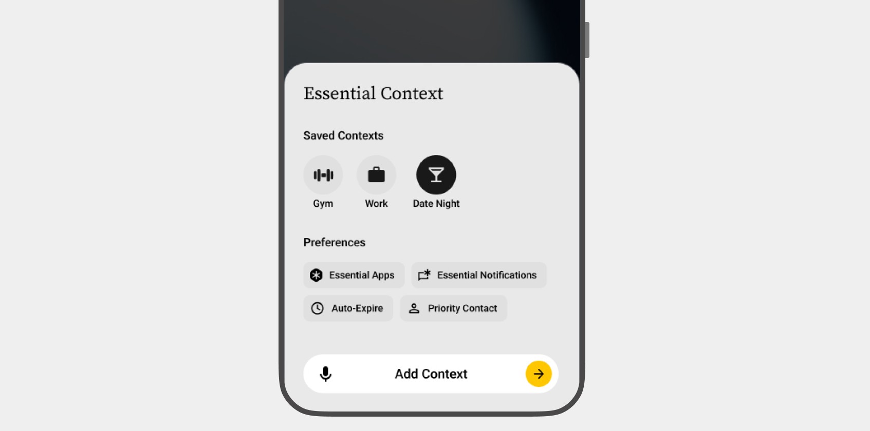 The Solution: Essential Context intelligently surfaces tools exactly when you need them. By holding a button and stating your situation, the OS instantly generates a personalized, temporary home screen tailored to that specific moment.