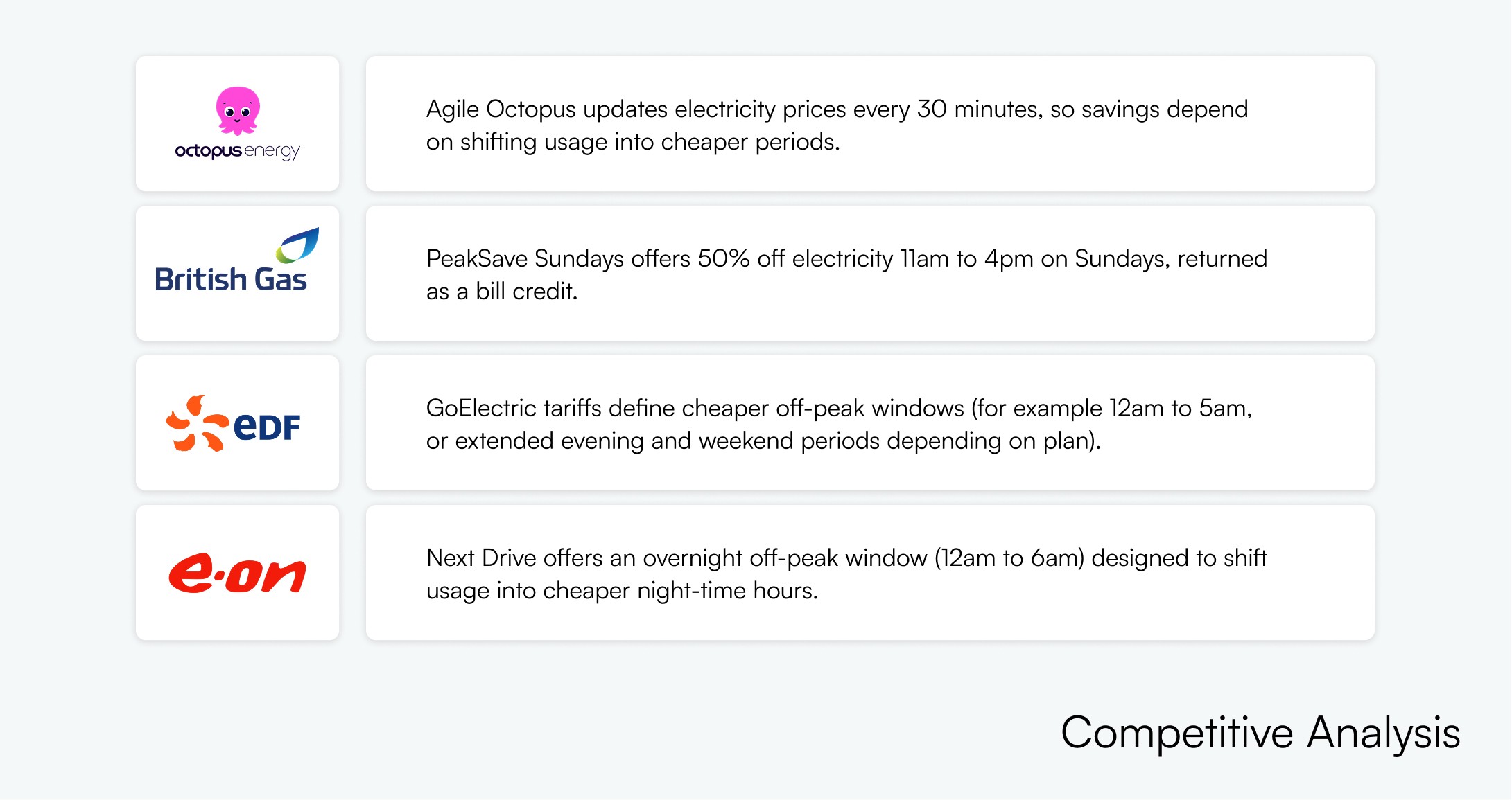 After anchoring on Sarah, we scanned how other providers drive load shifting. Most approaches either rely on fixed off peak windows and discounts, or expect customers to actively monitor prices and plan ahead.