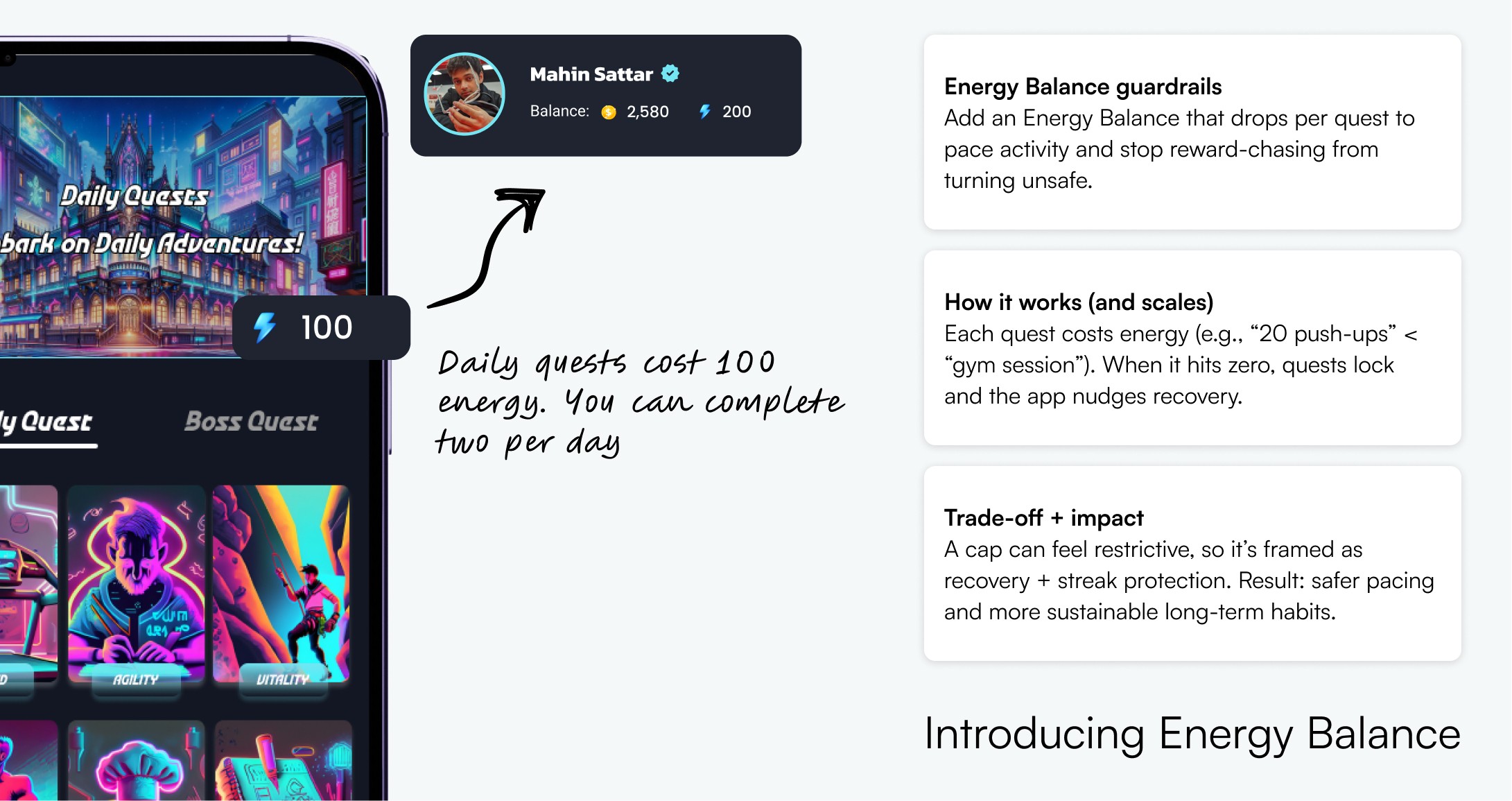 Energy Balance keeps Quest Up motivating while adding a clear pacing rule. Users can still chase progress, but the system protects them from overdoing it, which supports safer play and longer term consistency.