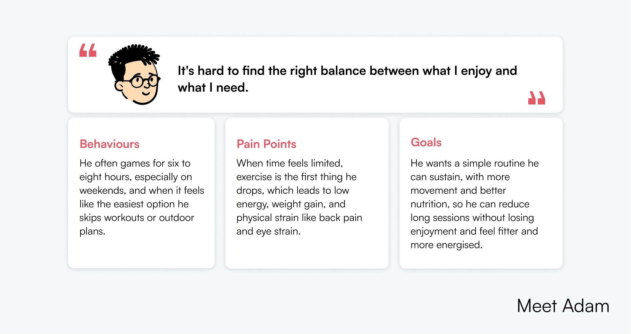 Meet Adam, a 21 year old computer science student who loves gaming, but is starting to feel the health impact of long sessions. He wants healthier habits, but struggles to stay consistent without giving up what he enjoys.