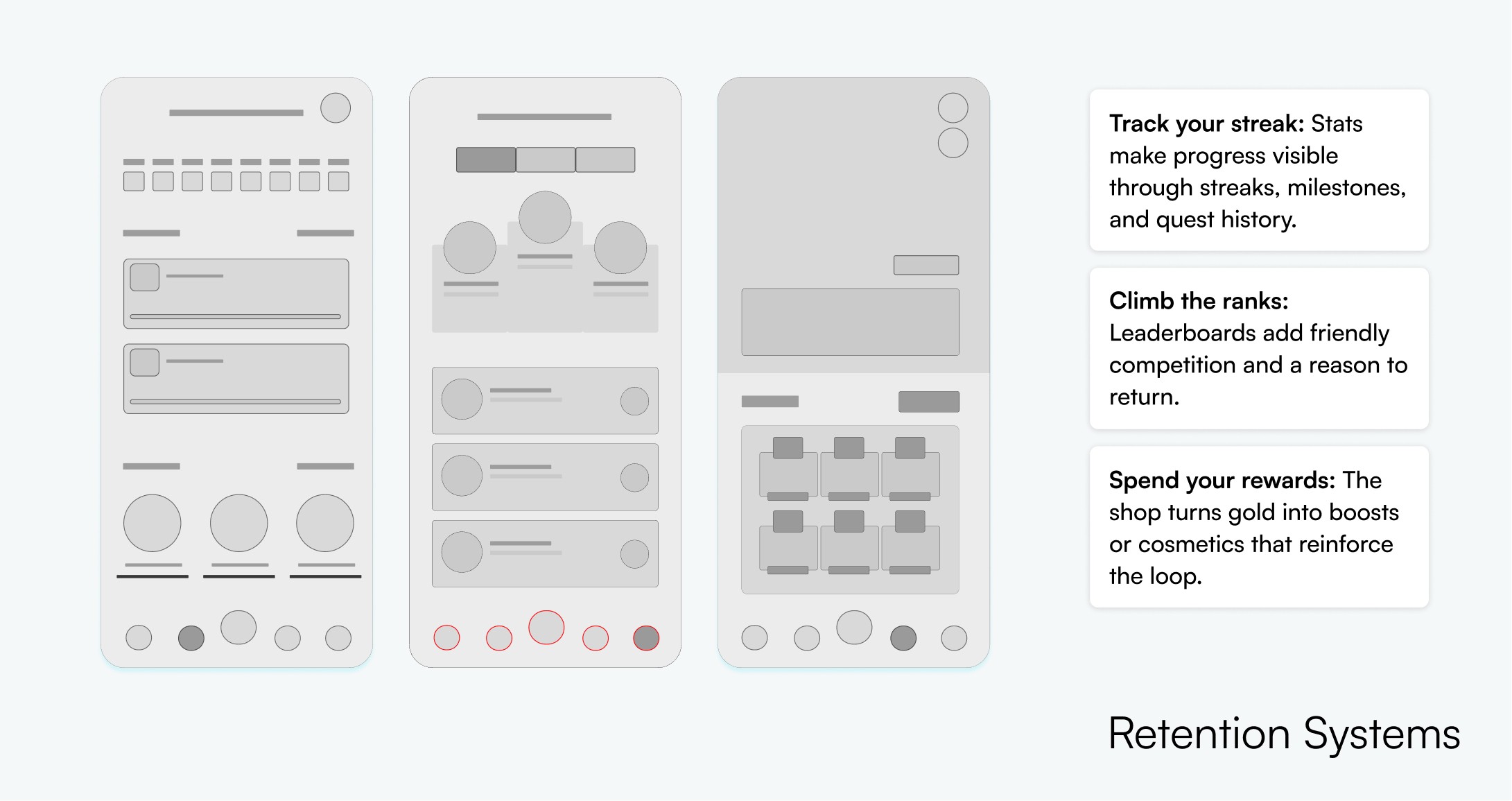 The retention layer reinforces the loop through progress visibility (stats and streaks), social motivation (leaderboards), and self expression (shop and customisation). It keeps users coming back without adding complexity to the core action.