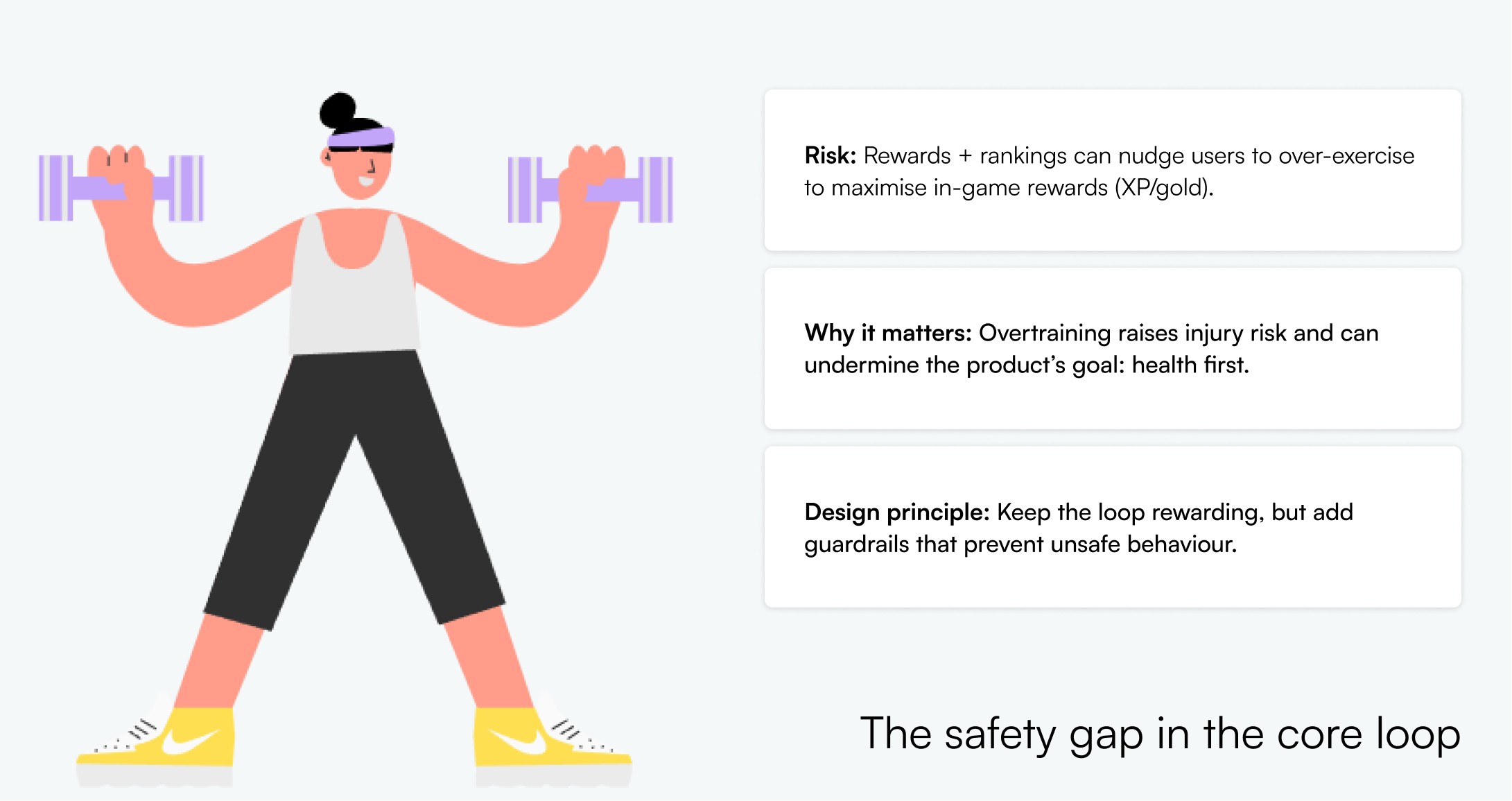I ran guerrilla usability tests, followed by a short post test interview to understand decisions and motivation. Many issues surfaced, but one stood out: when XP, currency, and rankings drive progression, some users may push beyond safe limits to optimise rewards.